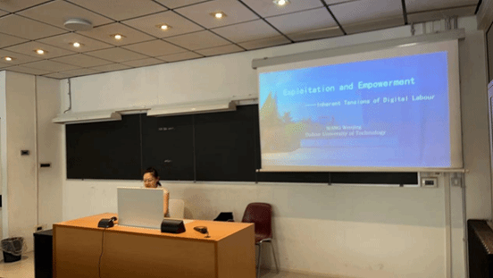 王文敬老师做了题为《Exploitation and Empowerment》的主题报告,指出数字劳动在存在技术剥削的同时也存在对数字劳动者内在赋权的可能性,反映了资本与劳动者权力斗争中的动态博弈过程,其本质是一场以技术为工具的资本与劳动者之间的权力争夺。在讨论与交流环节中,王文敬老师就数字劳动概念等问题与来自意大利、英国、美国等国家学者展开了热烈的讨论,将我国在数字劳动中的研究成果和时代主张推广到世界学术舞台。