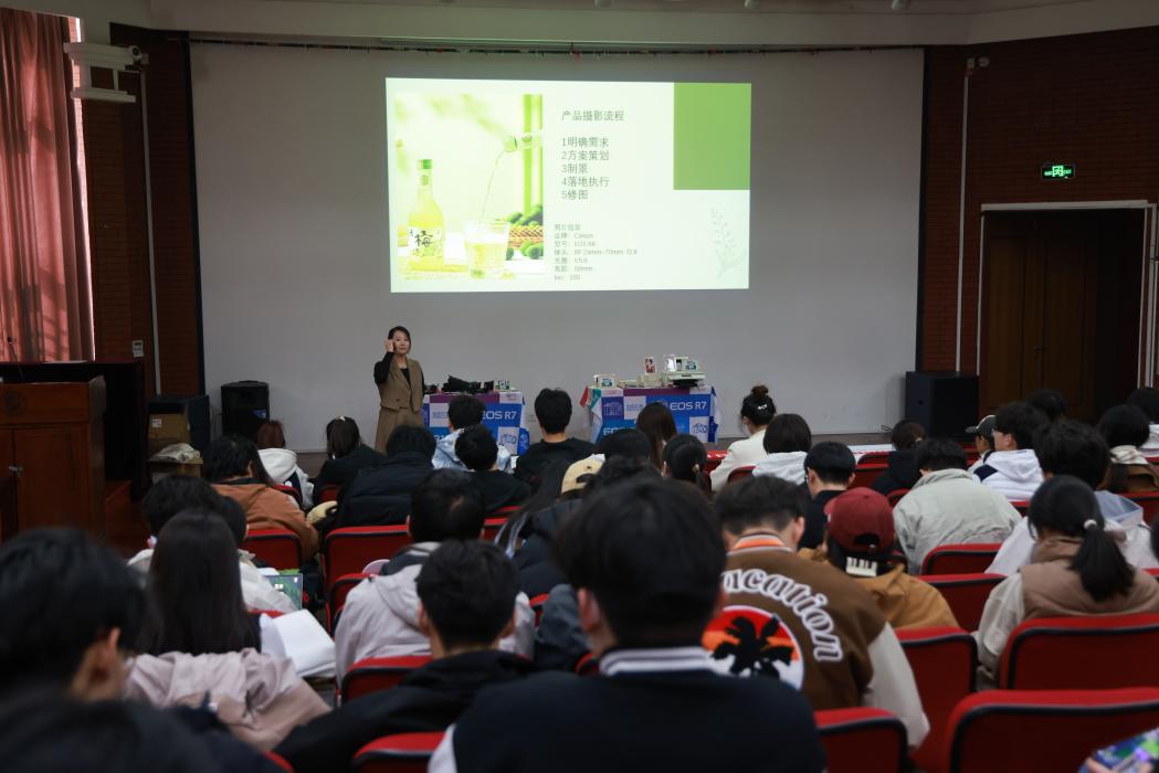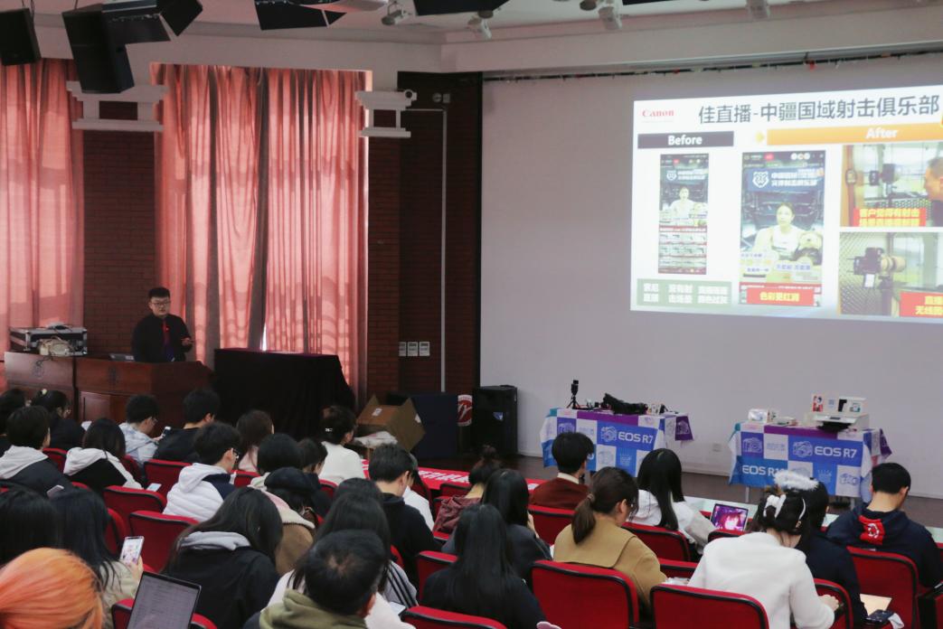 首先,佳能沈阳分公司的宣讲人从相机如今的“便利性”引入,介绍佳能相机的自动模式,对焦呼吸矫正与触屏等功能,这些功能模式让相机摄影操作如智能手机般简单;为同学们介绍如今佳能公司的项目之一——佳直播,“佳直播”助力多个大型集团的产品直播,如海尔集团,佳能为海尔集团直播搭建直播系统如导播台等,也与南方航空公司、中疆国域射击俱乐部等集团合作,介绍佳能相机在直播拍摄中的优势。