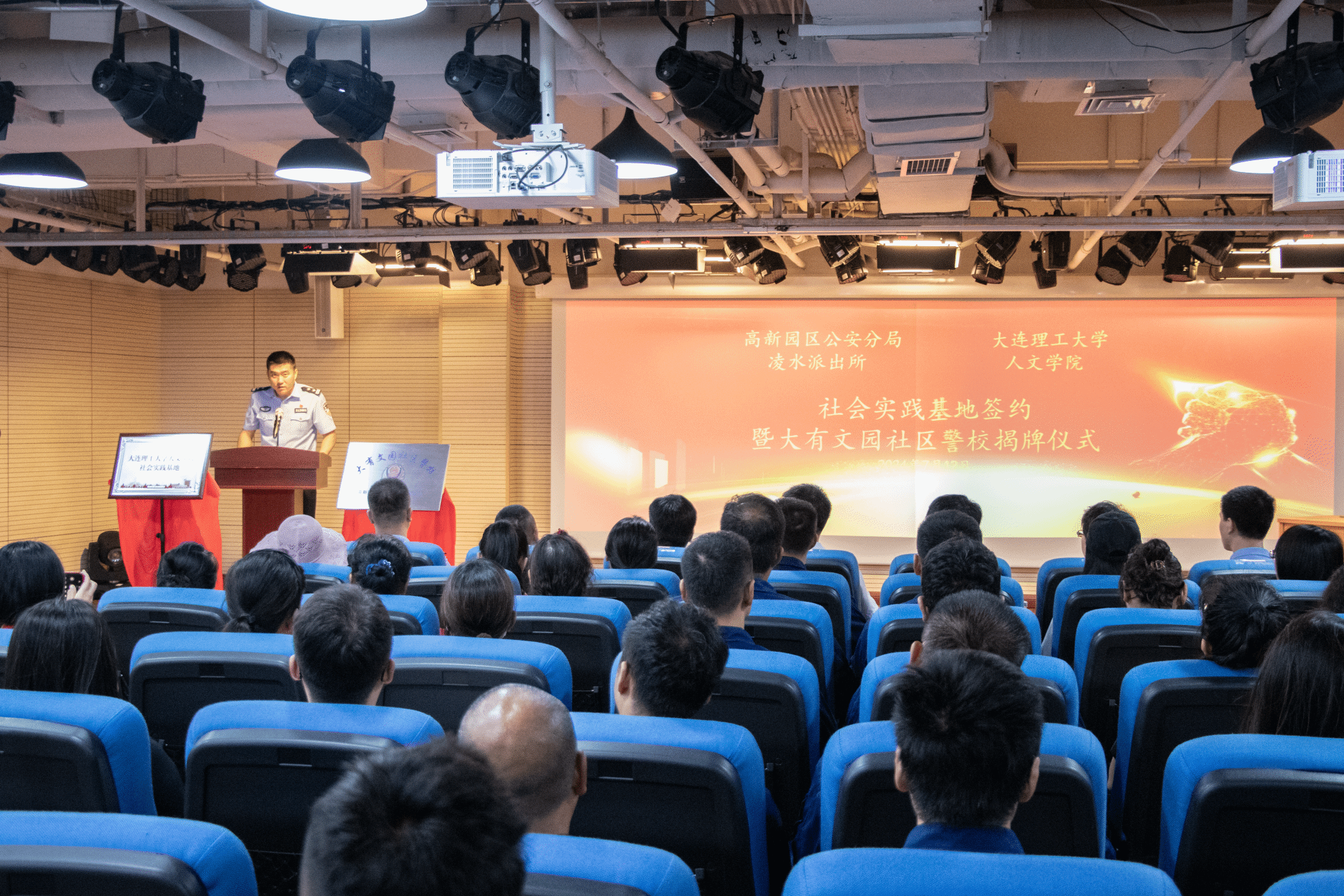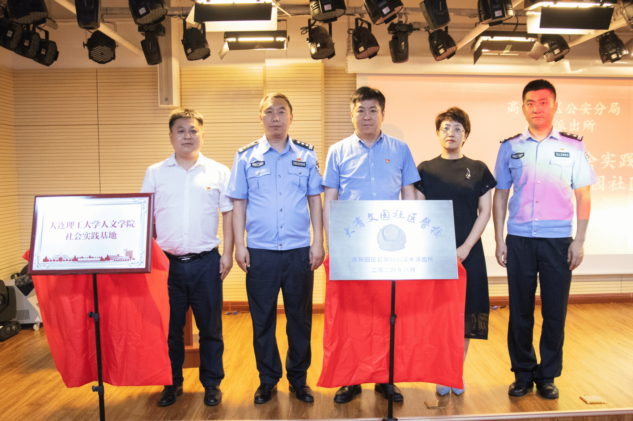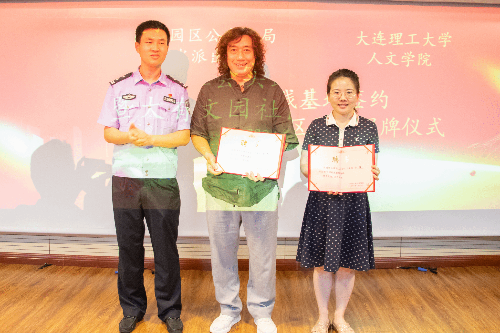 胡雪鹰处长、张远航书记、副局长李炜、副书记梁春艳分别为实践基地、大有文园社区警校揭牌。大连理工大学人文学院副教授赵岩、副教授张橦接受聘书。