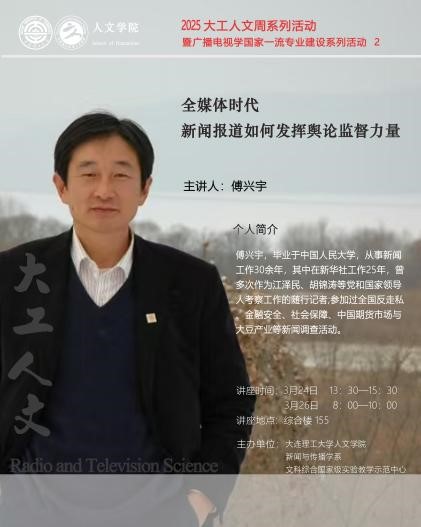 3月24日、26日,新闻与传播学系邀请新华社大连支社高级记者、前任社长傅兴宇老师,为专业师生作了《全媒体时代新闻报道如何发挥舆论监督力量》的主题讲座。
