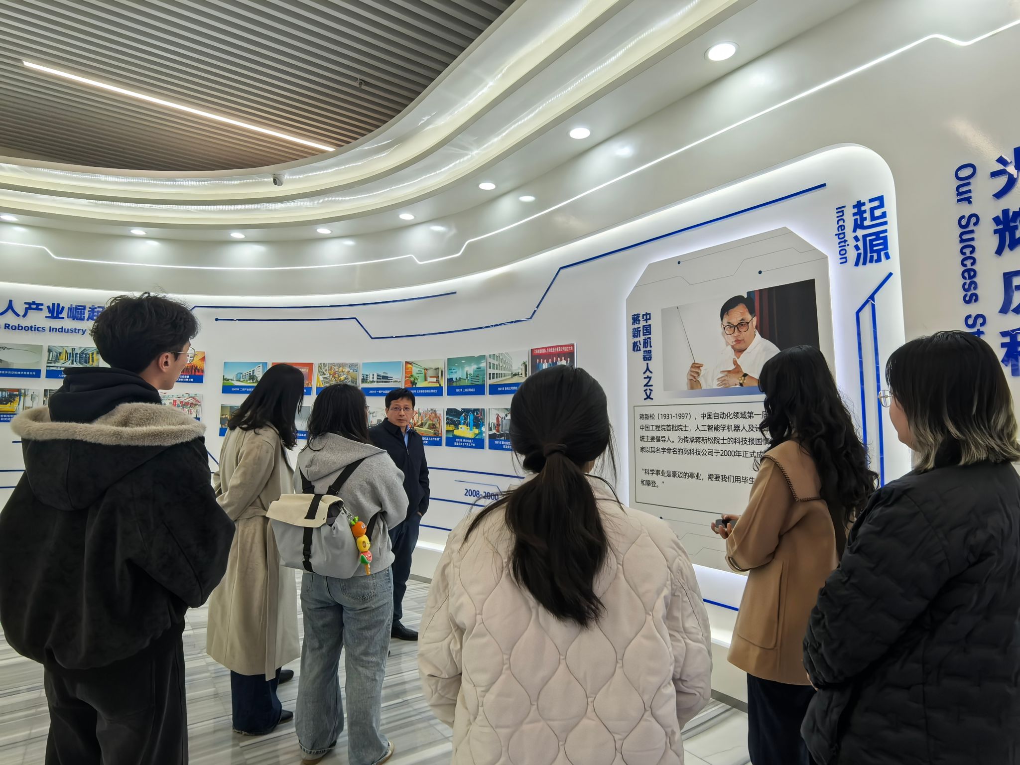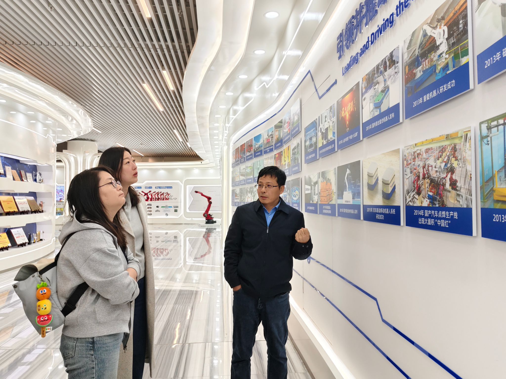 首先,在新松公司医疗与服务机器人事业部总经理李学威、部长陈禹希的带领下,团队参观了新松公司展厅,详细了解了新松公司的发展历程、创新成果及理念蓝图,领略了其切实践行习近平总书记“要时不我待推进科技自立自强,只争朝夕突破‘卡脖子’问题,努力把关键技术和装备制造业掌握在我们自己手里”嘱托的奋斗历程;随后,团队走进智能化生产车间,观摩学习了新松公司展示的多种协作机器人及多功能机器人的历史沿革,并近距离感受了智能化、数字化生产链条的系统性与科技感。