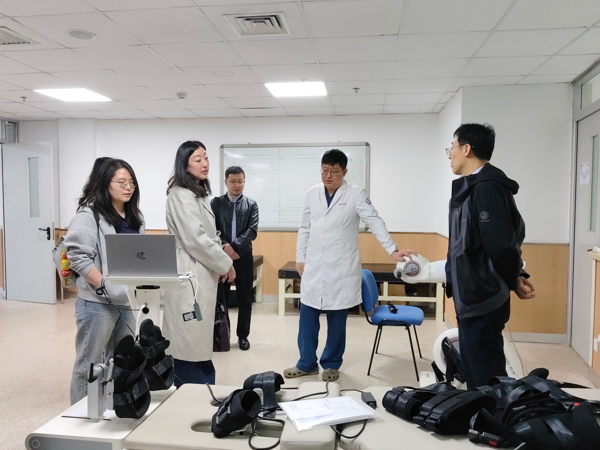 当日下午,在中国医科大学附属盛京医院区域医疗中心建设办公室、沈北院区综合办公室李海亮主任和康复中心治疗部何宇医生的陪同下,团队成员走进中国医科大学附属盛京医院(沈北院区)康复中心,实地参观学习智慧康养机器人在临床医学实践中的应用实例。此外,团队成员与医护人员进一步交流了相关康养设备在临床实践中面对的实践难题,如医学伦理审查中的知情同意问题、“医-工-患”新模式下患者的技术接受度问题及家属代位同意的界限问题、“医工融合”下工程师与临床医护人员存在的“结构-功能”上的互动和优化问题,这也为团队成员在医学哲学与医学伦理、医学技术媒介传播等领域提供了进一步的现实问题导向。