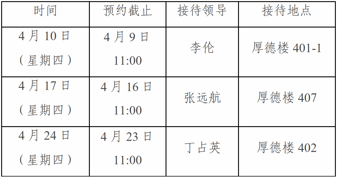 5.预约者请填写《人文学院领导接待日预约登记表》(附件),简述来访事由、时长等,在预约截止时间前发送至邮箱:rwxy@dlut.edu.cn,如有附件可随登记表一并发送。