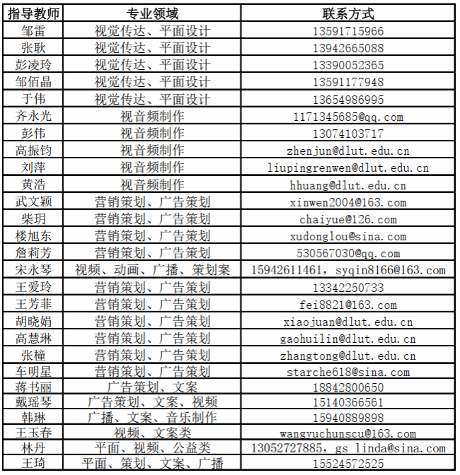 第十七届大学生广告艺术大赛大连理工大学选拔赛组委会提供有关指导老师的名单及联系方式,参赛同学可根据作品种类自行联系指导老师(请短信或邮件形式联系指导教师)。