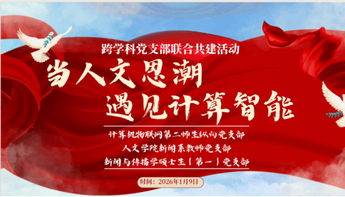为深入推进一融双高,创新“党建+”的内容与形式,发挥党员在卓越发展中的先锋作用,1月9日下午,人文学院新闻系教师党支部、新闻与传播学硕士生(第一)党支部和计算机物联网第二师生纵向党支部成员在海山楼A1002联合开展了以“当人文思潮遇见计算智能”为主题的跨学科党支部共建活动,以交叉思维共同探索人工智能时代下人文社科与计算技术的深度融合。